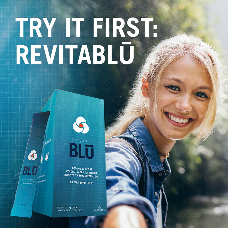 คิดค้นสูตรส่วนผสมโดยผู้บุกเบิกการวิจัยด้าน stem cell RevitaBlū ประกอบด้วยส่วนผสมจากพืชพรรณธรรมชาติ อาทิ สาหร่ายสีเขียวแกมน้ำเงิน, ซีบัคธอร์น เบอร์รี, ว่านหางจระเข้ และน้ำมะพร้าวผง ส่วนผสมที่ทุกคนต่างเสาะแสวงหาเหล่านี้เป็นที่ขึ้นชื่อในเรื่องความบริสุทธิ์ไร้สารพิษ เมื่อผสานเข้ากับส่วนผสมเอกสิทธิ์เฉพาะที่ช่วยเติมน้ำให้ร่างกายพร้อมช่วยเสริมสุขภาพ RevitaBlū ผลิตขึ้นจากผลการศึกษาทางวิทยาศาสตร์เพื่อช่วยเติมความกระปรี้กระเปร่าให้กับการใช้ชีวิตของคุณ สดชื่นและมีพลังด้วย RevitaBlū